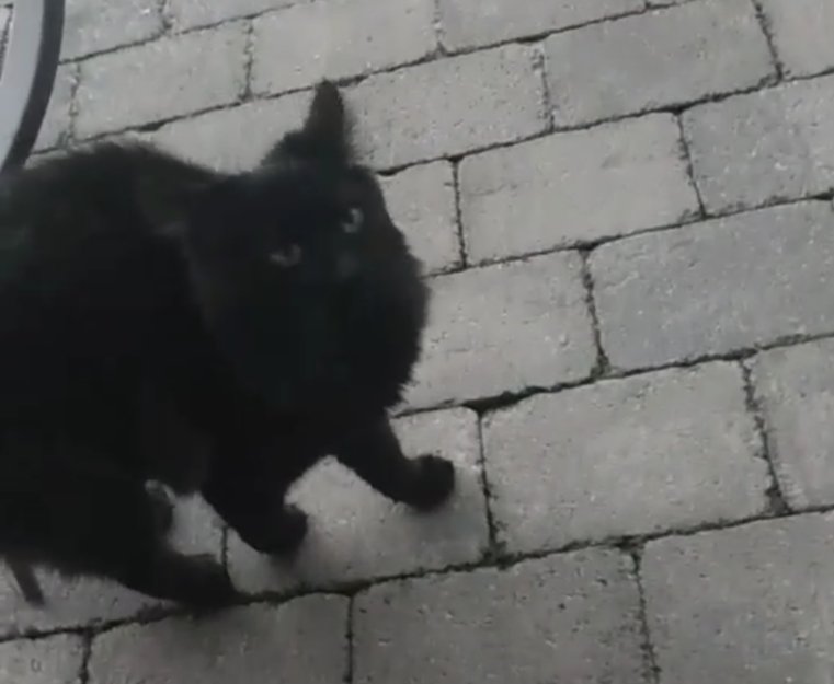 Langhåret svart pels, da katten først dukket opp var den ganske mager, har fått litt tørrfor utfor