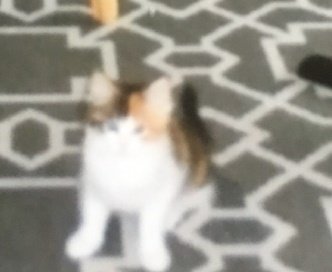 Trefarget, gul/brun, grå og hvit. Den har hvite forlabber, på brystet og i ansiktet. Den har en kraftig to farget hale. Den er sky og vanligvis ikke oppsøkende med mennesker. Den har chip i øret. Bildet er tatt noen den var kattunge, nå er den 2 år.