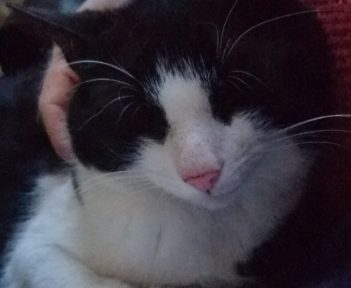 Hvit på bryst og høyre forlabb, sort på venstre forlabb og baklabbene ( med hvite poter). Hvit på magen, sort resten.