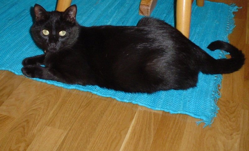 Stor katt (ca. 6-7 kg), med lang hale og gulaktige øyne. Mjauer litt rart og er litt tjukk.