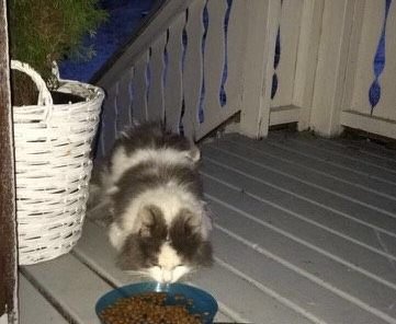 Denne lille skatten kommer å ber om mat til oss hjemme på Sunnan. Den er pjuskette og ustelt i pelsen. Hvit og svart/grå. Den virker litt redd så jeg har ikke fått tatt en skikkelig titt på den. Men er veldig sulten.