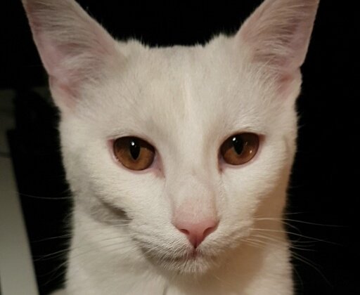 Ensfarget hvit med unntak av litt beige farge på toppen av hodet mellom ørene. Han har ravgule øyne. Veldig snill.