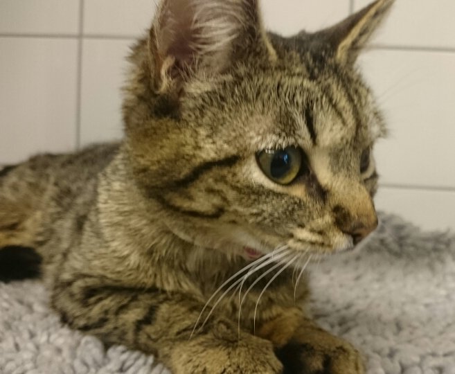 Katten ble funnet på Borgen i Asker og levert inn på Smådyrklinikken, Veterinærhøgskolen lørdag 15.april. Den har en skade i venstre bakben, men virker ellers OK.