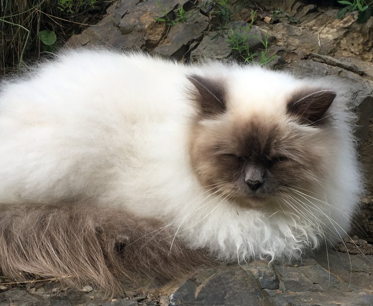 Hellig birma, hvit, blåmasket ansikt, hvite poter, blå øyne. Litt kortere pels enn vanlig grunnet operasjon. Barbert midt på halen grunnet bitt/ infeksjon.