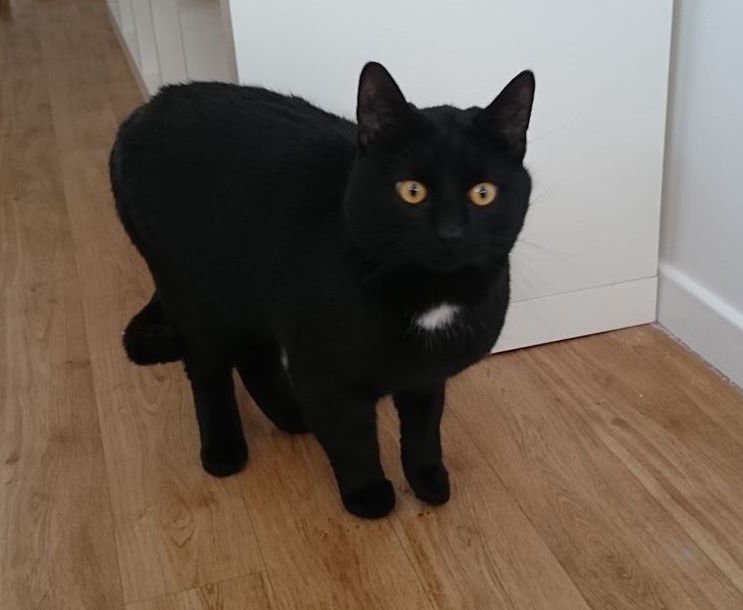 Katten er tillitsfull og virker ung. Helsort med en hvit flekk i brystet.
