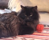 Åtte år gammel kastrert hankatt, langhåret. Han ser svart ut, men har mørkebrune striper også, særlig under buken. Han er noe reservert av seg, men veldig glad i mat.
