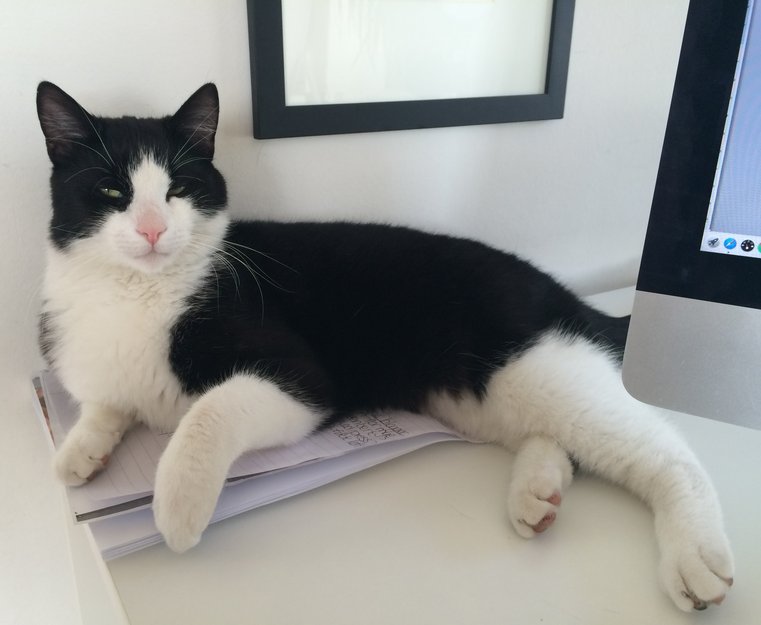 Stor katt, ca. 5 kg. Har svarte prikker på begge bakbeina og veldig fin korthåret tett pels. Litt sky mot fremmede men liker jenter og damer. Han lar seg sjelden klappe før han stoler på deg, men da kan han være kosete. Liker ikke å bli båret, kan kjempe seg løs. Oppholder seg gjerne nær barn som leker og er veldig nysgjerrig.