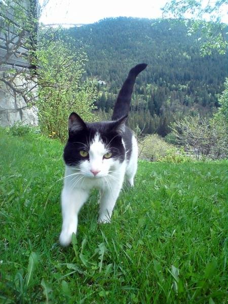 Svart og hvit korthåret hannkatt. Svært rolig, snill og tillitsfull.