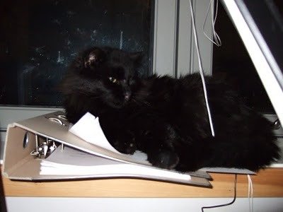 Langhåret sort hannkatt, lite arr over nesen, rødt halsbånd