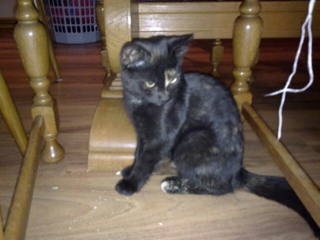 Bildet er gammelt, katten er større nå. Pen, svart katt med lysebrune hår spredt som små flekker rundt i pelsen. Markert "flekk" ved nesen som går over venstre øye.