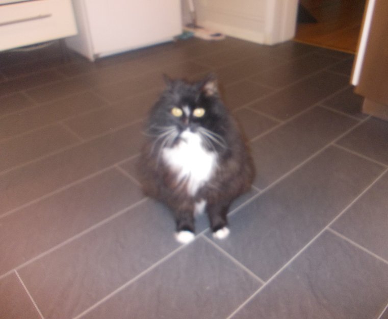 Den begynte å henge rundt her, og forsynte seg med tørre brødskalker vi hadde kastet ut til fuglene. Den var sulten, og veldig redd mennesker. Vi har gitt den husvære, med mat og varme. Den stoler på oss nå, men er livredd andre mennesker.