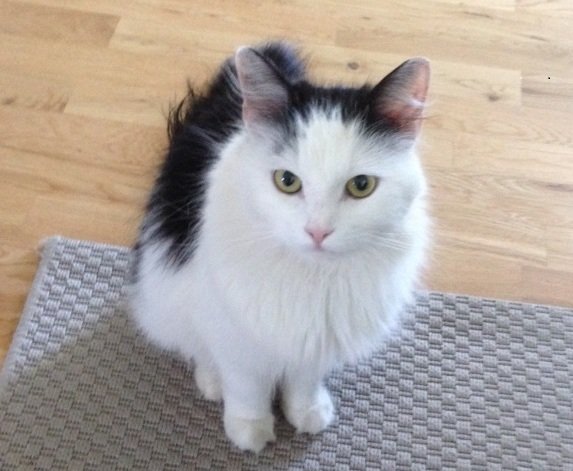 Veldig "søt" og vakker katt, stor, hvit "løvemanke" rundt halsen. Løvemanken er større nå enn på bildet, som er fra da hun var litt yngre. Hun er snart to år gammel, er kastrert og chippet.