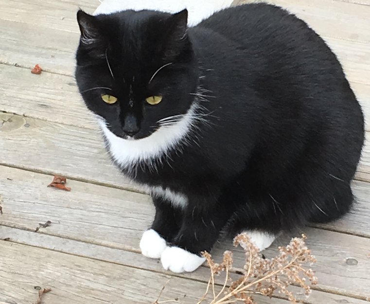 Svart kropp med hvit flekk under haken og noen hvite flekker på magen. Hvite poter, både foran og bak.
