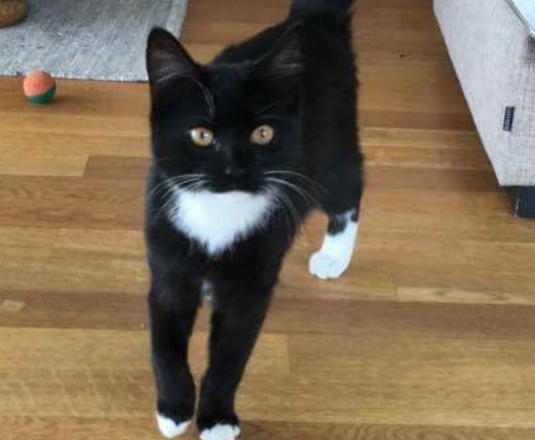 Kattunge, 7-8 måneder, sort pels med noen hvite partier, orange øyne.