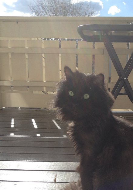 Han er brunsvart, langhåret, men har fått "løveklipp" frisyre pga tover i pelsen. Han er chippet, og hadde et lilla halsbånd da han forsvant. Han er 4-5 år, men virker yngre. Han er ganske sky.