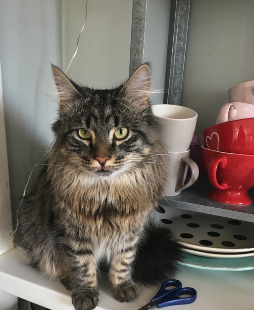Theodor er ca ti måneder og aldri vært ute før ! Han er langhåret skogskatt med mørk grå , brun ,vanilje , hvit pelsen . Veldig kosete og glad i barn , han bor også sammen med en voksen hannkatt.