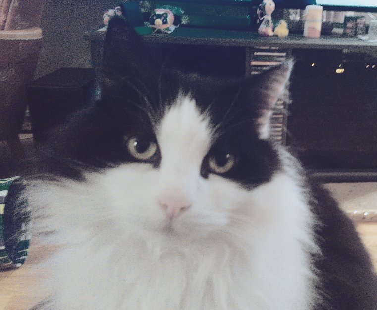 Molly er en svart og hvit langhåret katt med et mørkt og et lysere øre, det venstre øye har en rift på nedre øyelokk, hun hører dårlig men ragerer på plystring, er en nyskjerrig og kosete katt, praten og som gjerne går inn i opne boder, garasjer, biler osv