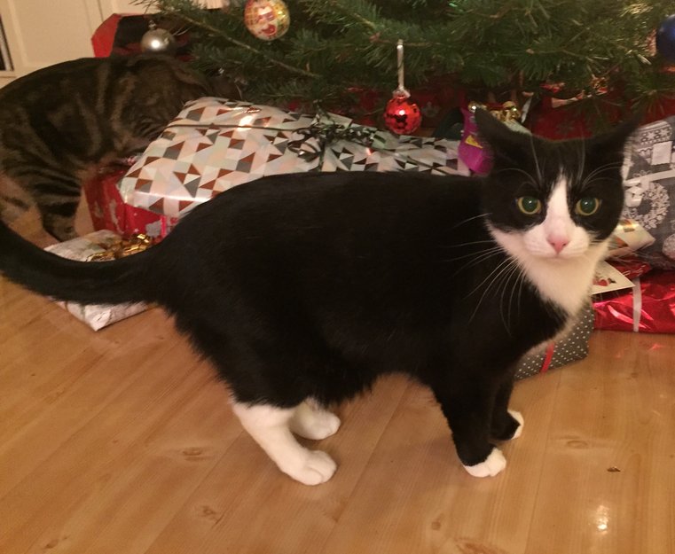 Svart og kvit stor hokatt. Ho er pittelitt kvit på haletuppen, nesten ikkje synlig. Kvit på alle potar. Ho er kvit i fjeset og litt på magen, ellers heilt svart.