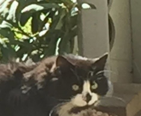 Svart prikk på nesa og smoking sløyfe under haka. Stor og fin fin pus(5,5 kilo). Håper det er noen som savner han.