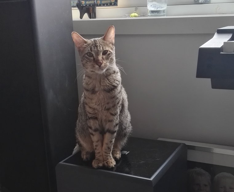 Brun med spotter. Slank, ikke så stort hode. En veldig søt mjauing.