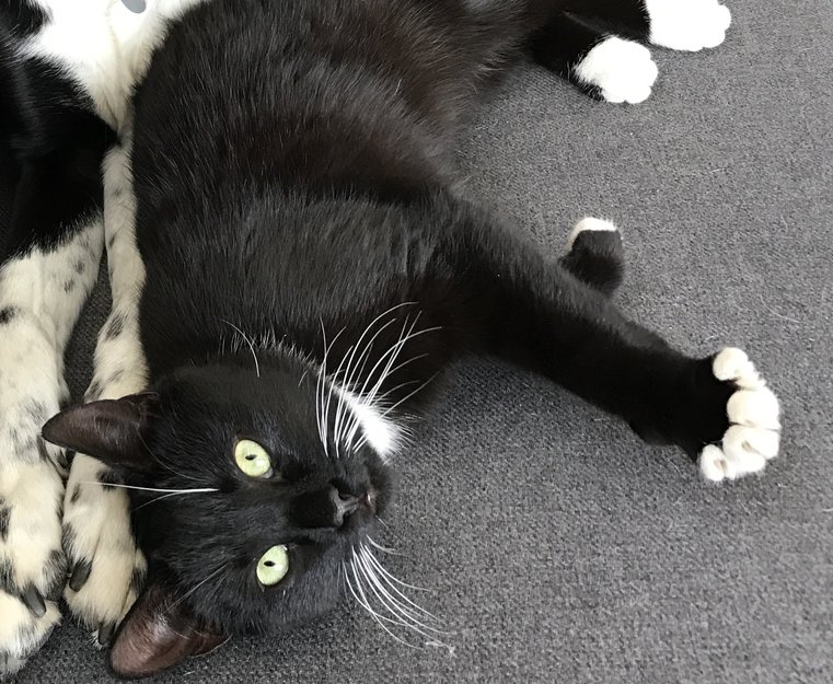 Korthåret svart pels med hvite poter. Han er også hvit på bryst og mage.