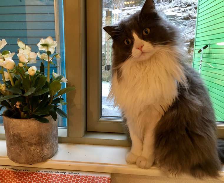 Han er en blandingskatt; grå og hvithåret lang pels. Ganske stor katt. Snill og menneskevennlig. Vi savner han.
