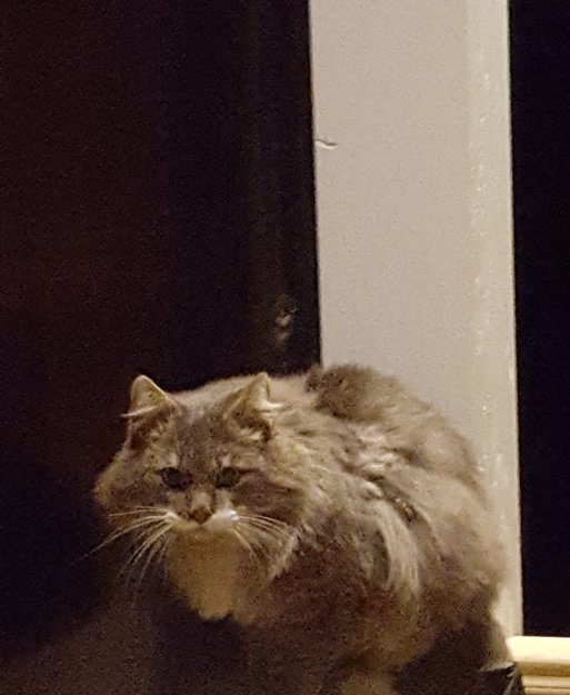 Grå langhåret med hvit ansikt og poter. Veldig tillitsfull. Vandrer rundt mellom oss og naboene