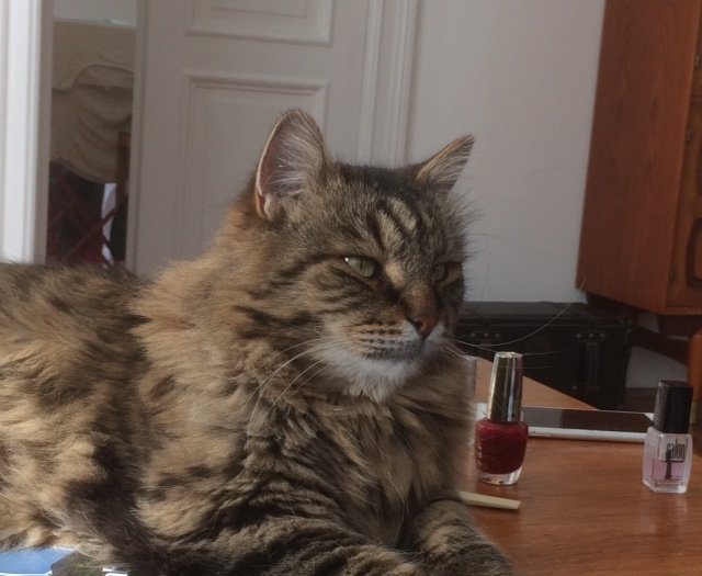 Stor Sibirkatt ca 5,5 kilo. Ekstraordinær flott og fyldig hale. Hvit under haken, grønne øyer. Hvite hår i ørene. Pels mellom potene.