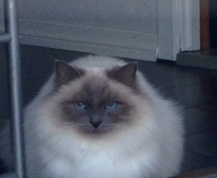 Blåmasket hellig birma. Lys pels, grått ansikt og hale, blå øyne. 7 år gammel.