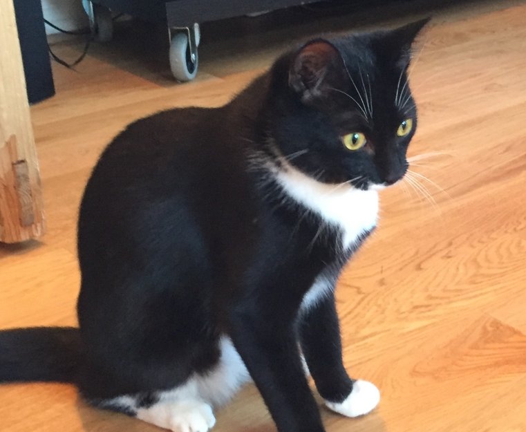 Pusil er svart med hvite labber og en liten hvit flekk under nesa