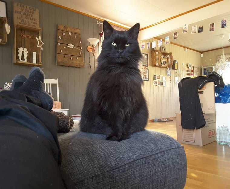 Stor svart hannkatt. Enkelte grå hår her og der, pelsen skinner rustbrunt i sollys. Ikke så glad i unger, og kan være skeptisk til fremmede, men er veldig kosete når han føler seg trygg.