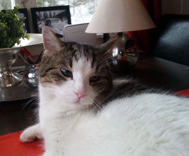 Harry Lenco hadde klart å komme seg inn i garasjen til en nabo, og der har han vært uten vått eller tørt i ca to uker, så det var en slank og meget sulten, og tørst katt vi fikk hjem i går ettermiddag :)