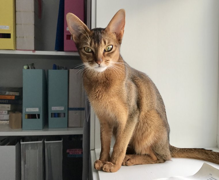 Viltfarget abyssiner. Hun er drøyt året gammel og er liten og nett. Har på seg rødt halsbånd hvis det ikke har falt av.