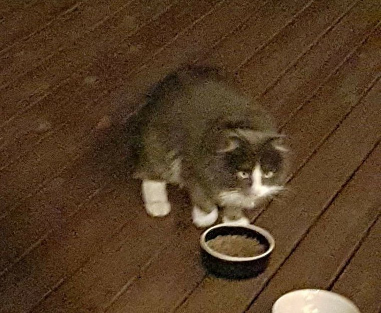 Ung katt, trolig hanne. Grå og hvit semi, hvit fra mellom øynene og ned til brystet. Hvite sokker framme og hvite lange sokker på bakbeina . Er tam , men sky. Ikke fått tak i den, men den er stadigvekk innom. Har film. Vennligst ta kontakt om du kjenner denne.