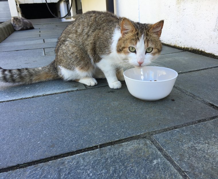Korthåret hannkatt dukket opp utenfor huset vårt tirsdag 9. mai. Han er tam, snill og kosete.