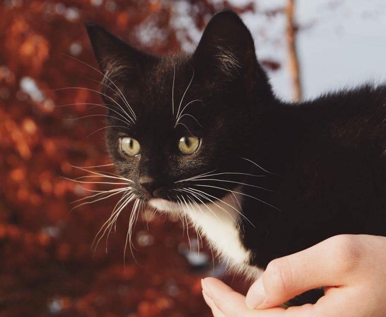 Svart med stort hvitt bryst opp til haken og hvite "sokker" på alle poter. Kastrert hannkatt som er meget sosial og godt vant med hunder. Dessverre uten halsbånd og chip, snart 1 år gammel.