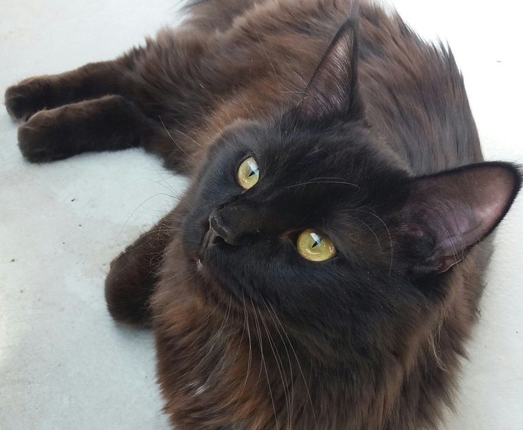 Brunsort langhårete pels med fluffy hale. Kan være litt utrygg på ukjente mennesker. Ikke vant å være ute alene. 1 år gammel.