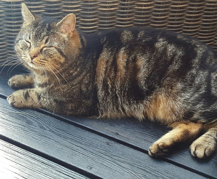 Han har en liten sort prikk ved siden av pupillen på hvert øye. Han kan være litt redd/skeptisk til mennesker.