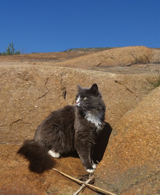 Stor kastrert hannkatt på 6 kg. Grå lang pels, med hvit nese, delvis hvit under hake, hvit på magen og potene.