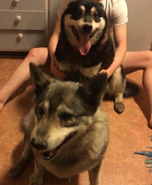 Hunnen: gråaktig, ser ut som en elghund, krøllet hale, virker som hun er en "eldre dame".. halter på høyre bakbein.