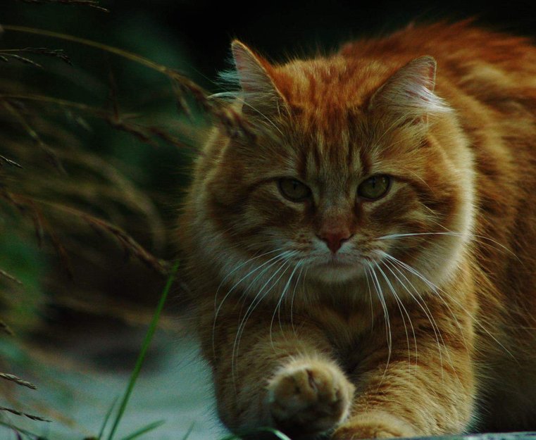 Stor buskete hale, romslig katt med knirkende mjauing. Kan virke noe lysere enn på bildet da det er tatt i solnedgangen.