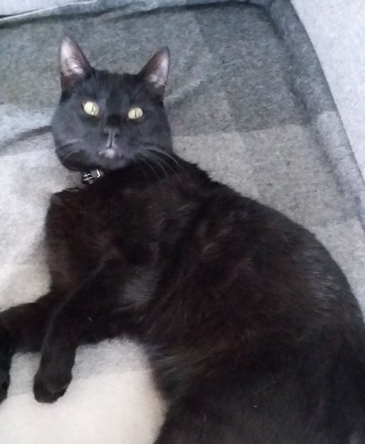 Ung hankatt, ett og et halvt år. Har svart halsbånd med bjelle (dersom han ikke har mistet den). Ellers helsvart, slank. Litt sky. Er kastrert og chippet.
