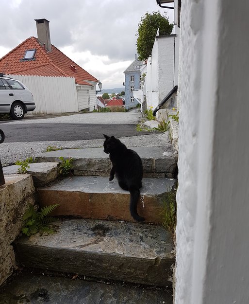 Tynn hunkatt som virker veldig redd kommer og står ved vinduet vårt flere ganger for dagen. Hun er veldig tynn og usikker. Kan ikke være mer enn 1-maks 2 år. Holder til over fløyen, men nedenfor skansen brannstasjon.