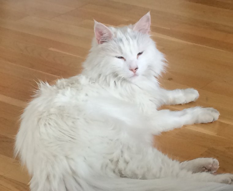 Liten svart flekk på sin rosa nese, blå øyne og ID-tatovering i venstre øret. Id-chip i nakken er registrert på Janne og Ninas omplassering. Finnerlønn: 2000 kr