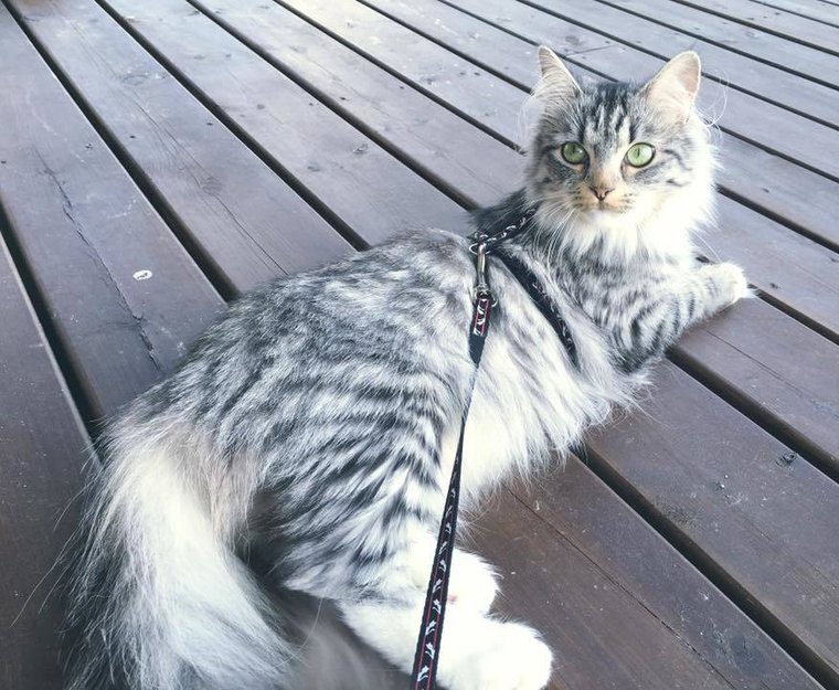 Hvite bakbein og litt beige på nesa. Lange hvite hår under alle fire poter. Veldig fluffy hale. Litt langhåret men ikke så mye pels og den sitter veldig tett inntil kroppen. Halen er veldig langhårete og nesten like stor som hun selv.