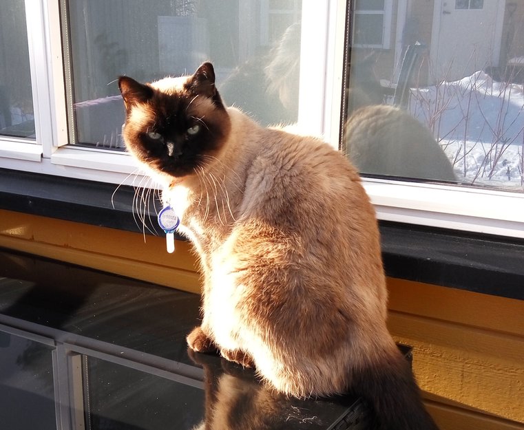 Mørkt hode og hale, nesten svart. Lys på kroppen. Hadde oransj halsbånd da han sist var sett.