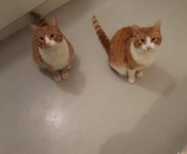 Rød og hvit korthåret. Messi heter han. Kan være sammen med broren ( til høyre på bilde) Kastrert og ID merket.