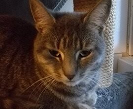 Ung katt, estimert av veterinær til å være mellom 1,5 og 2 år. Hunnkatt, arr i buken så vi antar at er kastrert. Ikke idmerket, ingen chip eller tatovering. Snill, men litt usikker i starten, da freser hun. Kosepus til tusen når hun slapper av.