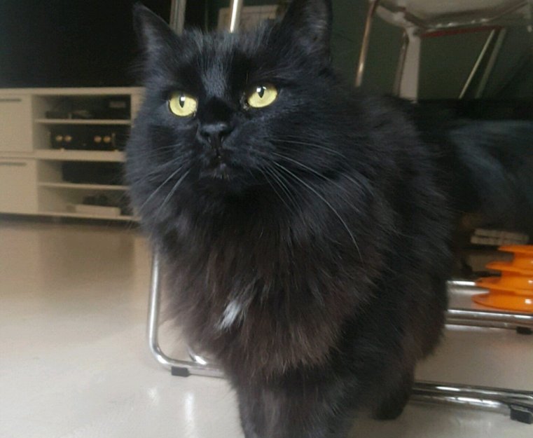 Hun er langhåret og helt svart bortsett fra en hvit flekk på brystet sitt.