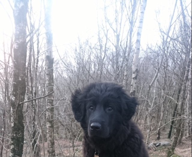Svart med hvit flekk på brystet og en hvit flekk på en av potene.